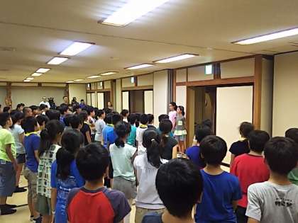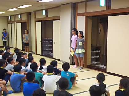 司会、あいさつの子、みんなでした宿舎の方に「よろしくお願いします」のあいさつがとても立派で、たくさんの学校のお世話をしている宿舎の方もびっくりされていました。