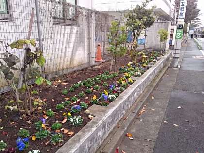 校舎北側の植栽スベースに地域の皆様と作った「桜町 花の小径」に新しい花が植えられました。