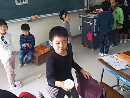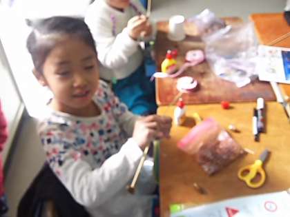 1年生が砧公園で拾ったドングリで工作をしてます。