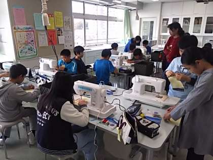 5年生が家庭科でミシンの学習に取り組んでます。