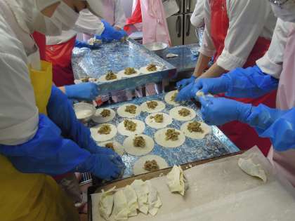 今日は給食アンケートで1位になったジャンボぎょうざでした!子供達も大喜びです!一つひとつ「ひだ」もつけているんですよ!