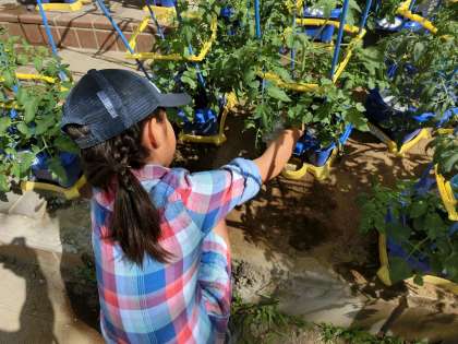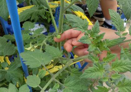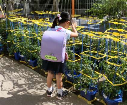 朝、青門に立っていると「校長先生!来てー!」と2年生に呼ばれました。行ってみると「ミニトマトが、できてきている!」と小さなミニトマトを見せてくれました。その嬉しそうな笑顔に、私も思わず笑顔になりました。2年生は登校するとすぐミニトマトに水をあげています。「背が高くなった!」「花が咲いた!」と毎朝発見の連続です。愛情をたっぷりもらっているミニトマトは、毎日グングン生長しています。