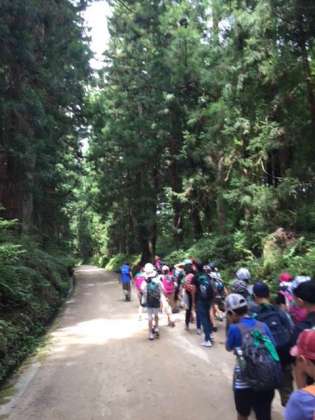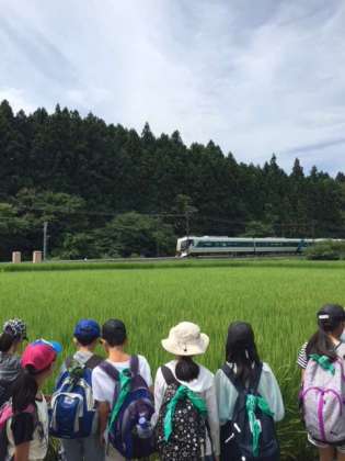 バスを降りて、だいや川公園に向かいます。杉並木を歩き、田んぼを通り過ぎ、東京とは違う自然に子供たちもわくわくしています。