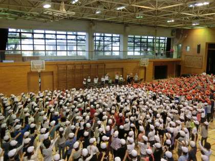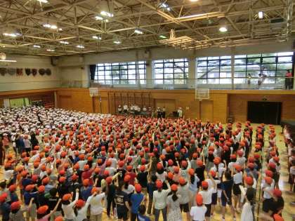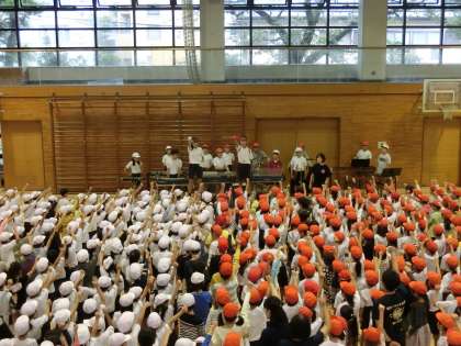 運動会の歌は「ゴーゴーゴー」です。赤組、白組の各団長の指揮で、1番は赤組、2番は白組、3番は赤組白組同時に歌います。歌の途中で掛け合いになるところがありますが、赤白お互いに競い合って声を出します。実際に歌い始めると、体育館は割れんばかりの歌声となりました。赤組、白組それぞれが一丸となって、そして赤組白組が一体となっている姿に、私は鳥肌が立ちました。運動会当日が今から楽しみです。
