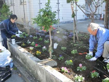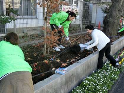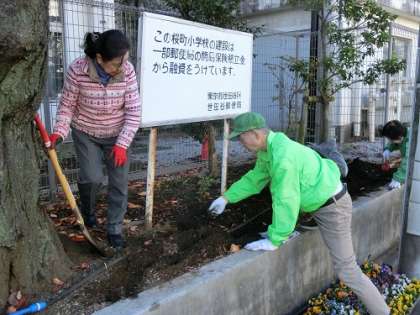 みなさん桜町小学校の北側の道路側に、「さくらまち花の小径」があるのをご存知でしょうか。四季折々にきれいな花が咲き、道行く人の目を楽しませ、心を温かくしてくれています。この「さくらまち花の小径」は用賀南町会の方が中心となり花を植えたり、管理をしたりしています。今日は、来春に向けて、花や球根を植える作業をしました。