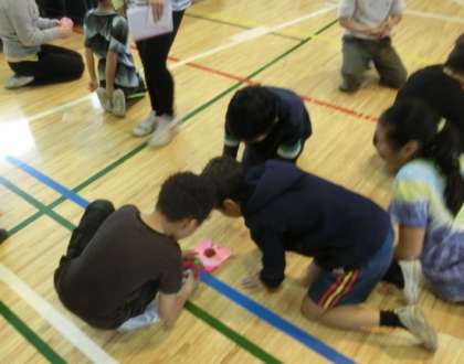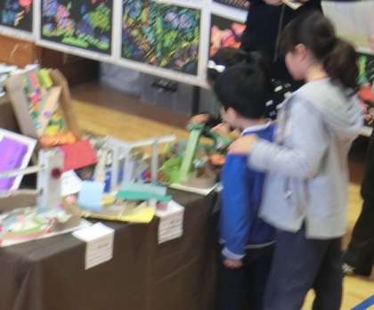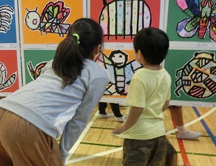展覧会2日目に、きょうだい学級で作品の鑑賞をしました。きょうだい学級は年間を通して活動をしており、その一環としてこの展覧会でも交流を行っています。きょうだい学級のペアでお互いの作品を鑑賞したり、交流作品で遊んだりする中で、作品について伝え合い、作品のよさやお互いを認め合う気持ちを育んでいます。