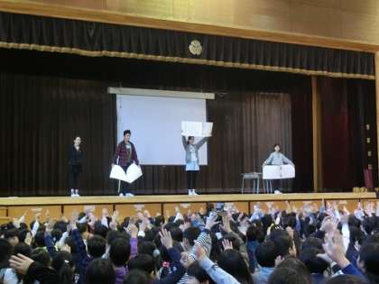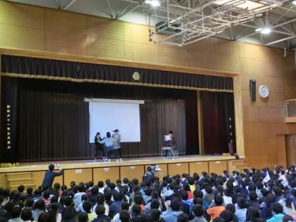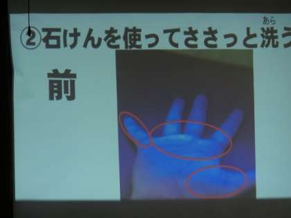 今回は、けがの防止と病気の予防について、全校に向けて発表しました。寸劇やクイズ、実験を通して、けがが起こらないようにするために気を付けること、インフルエンザの予防等につい分かりやすく伝えていました。手洗い実験では、洗い方の違いによってしっかり洗えていないことがよくわかりました。
