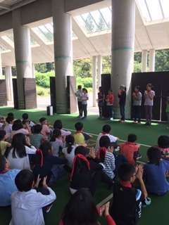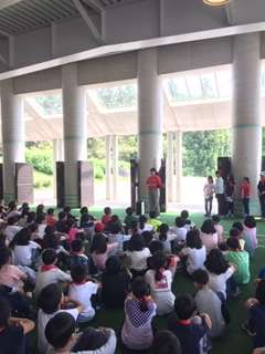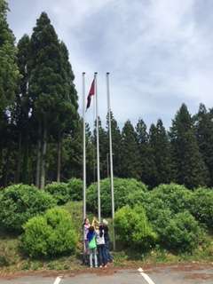 なかのビレッジに着きました。開室式を行い、これから3日間お世話になるなかのビレッジの方からお話をいただきました。また、なかのビレッジはこれから3日間私たち桜町小学校の教室となりますので、校旗の掲揚もしました。