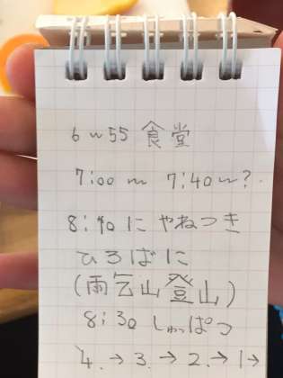 ある班長のメモです。集合時間より早い時間が書かれています。責任をもって班をリードしようという思いが伝わってきます。