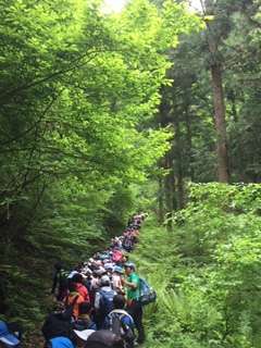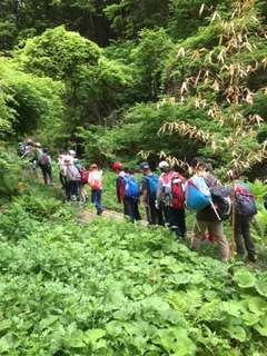 山もだんだん深くなり、緑も濃くなってきました。山頂までの道標を見つけると、子供たちは「おしっ!」と気合いを入れていました。