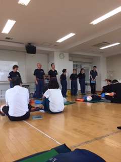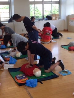 今週から本校も水泳の授業が始まります。水泳指導を前に、全教職員が玉川消防署の方から救命講習を受けました。心肺蘇生法(心臓マッサージ、人工呼吸の方法)やAEDの使い方等について実技を通して学びました。