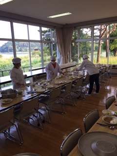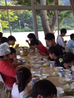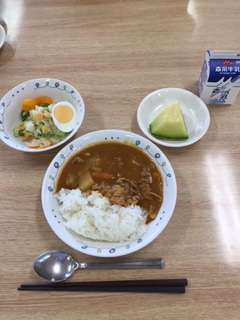 夕食です。当番の子供たちが、頑張って配膳をしてくれました。メニューは、カレーライス、サラダ、メロン、牛乳です。