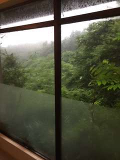 お風呂の時間です。待ち焦がれていたように、みんなやってきます。お風呂からは谷あいの景色が見られます。写真は生い茂った木々としか伝わらないと思いますが・・。