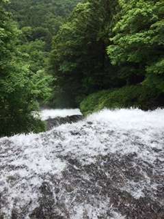 湯滝の横のつづら折を上がっていきます。上から見る湯滝も豪快です。少し歩くと湯ノ湖が見えました。