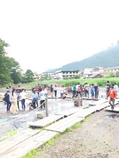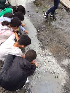 地面から湧き出る温泉に、子供たちは恐る恐る手を入れていました。ぬるいと分かると気持ち良さそうに、みんなでずっと手を入れていました。足湯ならぬ手湯でした。