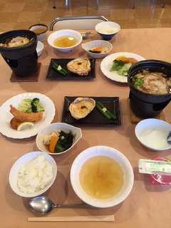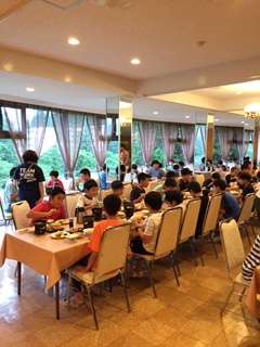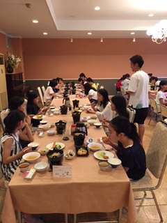 2日目の夕食です。今日のメニューの中に、ふくべ細工の材料である夕顔の実のかんぴょうがあります。そのことをアナウンスされると子供たちは、「おーっ」と言ってかんぴょうを興味深く見ていました。