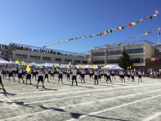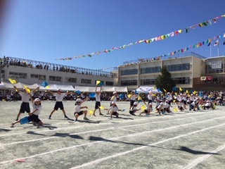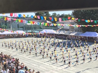 黄色と青の旗が校庭に映えています。2年生が一つになった素敵な演技です。