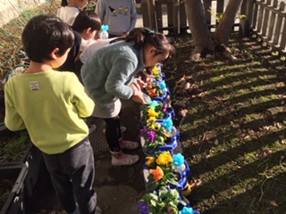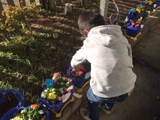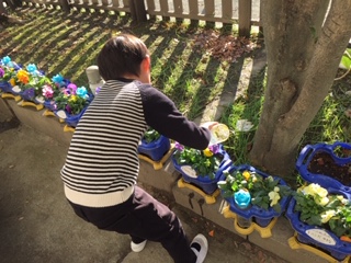 毎朝、1年生が自分で植えた花に水をあげています。水をあげる前に花の様子を観察する子、声をかけながら水をあげる子、その姿はとても微笑ましいです。心温まる朝のひとコマです。