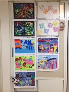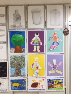 日ごろの図工の授業で作られた作品が並んでいますが、どの作品からもその子の思いや取り組みの姿勢が伝わってきます。廊下を歩いている子供たちも作品の前で足を止めて見ています。校長室の前は小さな美術館のようです。学校に来校の際は、ぜひご覧ください。