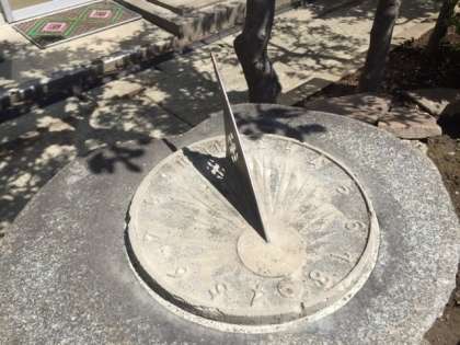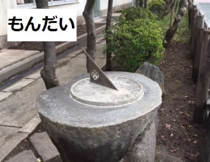 これは、日時計(ひどけい)といって影(かげ)によって時刻(じこく)を知(し)ることができます。まん中(なか)の写真(しゃしん)の時計(とけい)は10時(じ)をさしています。右(みぎ)の写真(しゃしん)はおなじ時刻(じこく)の日時計(ひどけい)ですが、10をさして10時(じ)を表(あらわ)しています。