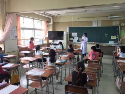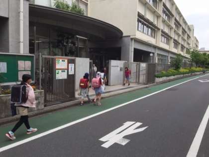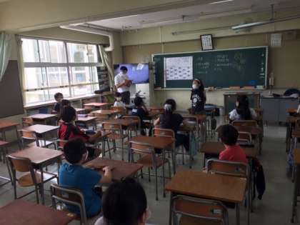 お昼過ぎ、各学年1・3・5組のAの子供たちが登校してきました。午後の部の開始です。「こんにちは」といって正門で迎えるのは、なかなかないことではじめは少し違和感がありましたが、子供たちは自然に「こんにちは」と挨拶をするので、すぐに慣れました。
