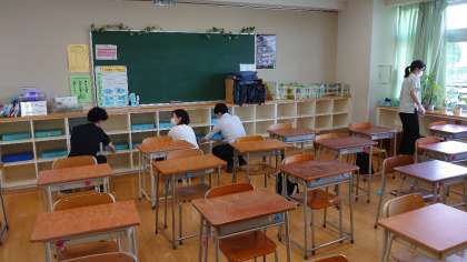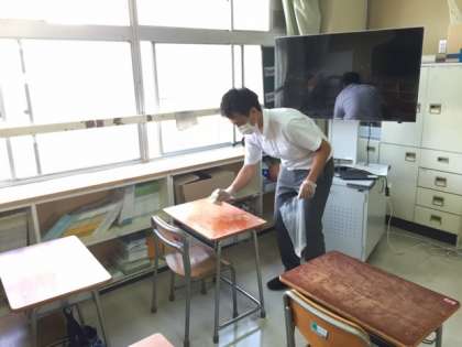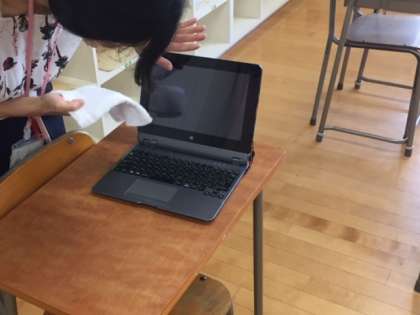 子供たちが下校した後は、机の上、棚の上や棚の中、手すりやドア、トイレ等々、みんなが使った場所を教職員で消毒作業を行っています。また、子供たちが使用したコンピュータ等も次の人が使う前に消毒しています。子供たちが安心して学校生活が送れるよう努めています。