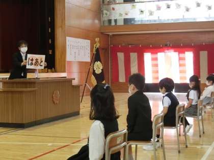 私から1年生の子供たちには、「はあと」を合言葉に、学校を楽しく過ごすためのことを話しました。1〜5組・わかくさ学級のどの子供たちも真剣に聞いていて、私の顔をしっかり見ていたり、言葉にうなずいたり、話が伝わっているということが分かり、とても話しやすがったです。もう立派な桜町小学校の1年生でした。