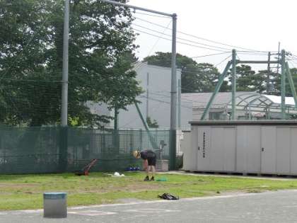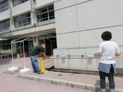 左の写真は、水道場で水が子供たちに跳ね返らないように主事さんがシートを張っているところです。右の写真は、副校長先生が芝の手入れをしているところです。子供たちのために、見えないところで頑張っています。