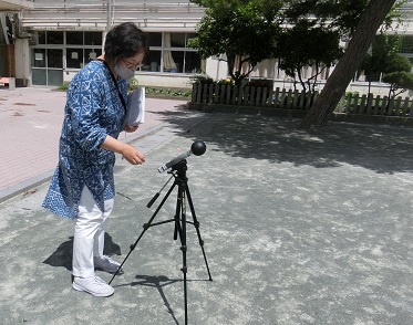 学校では、休み時間や屋外での学習等、子供たちが外で活動するときに暑さ指数(WBGT)を測定しています。左の写真の機器がWBGT測定器です。暑さ指数は、気温、湿度、輻射熱の3つを取り入れた指標(WBGT値)で表されます。指標が基準値以上になったとき、熱中症対策として、外での活動を中止しています。