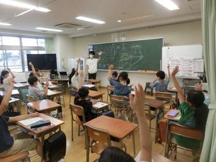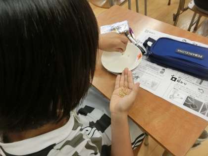 学校をまわっていると、5年生がお米の勉強をしていました。のぞいてみると、子供たちが楽しそうに学習していました。籾を手に取ってじっくり見ています。ある子が籾殻をむいて中から白いお米が出てきたら目を輝かせていました。