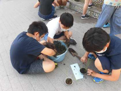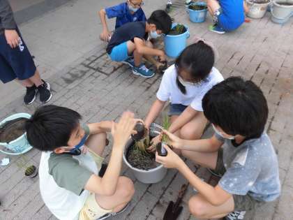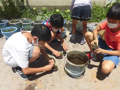 総合的な学習の時間で、5年生は稲を育てています。今回は育ってきた稲をいよいよバケツに植えかえます。泥の感触を楽しみながら植え替えていました。