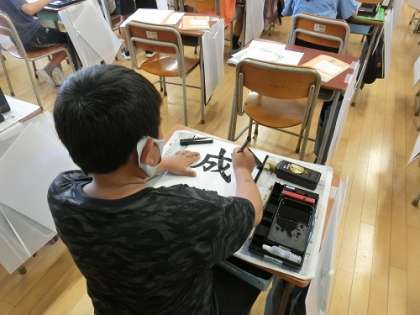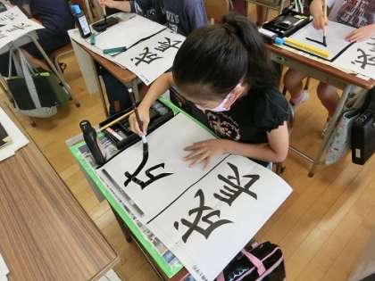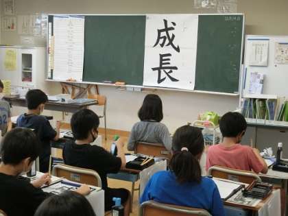 5年生の各教室で、習字の学習に取り組んでいました。姿勢を正して描いている姿とともに、字も一画一画とても丁寧です。5年生の子供たちの習字の学習の様子は、習字を始めた3年生のころから見ていますが、書いている字のごとくとても「成長」しています。
