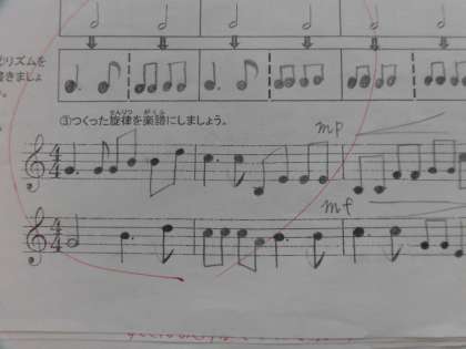 「和音の音で旋律づくり」では、パッヘルベルの「カノン」と同じ和音を使って曲作りをしました。音の上がり下がりやリズム、強弱や速さ、弾んだ感じや滑らかな感じなど、自分のイメージに合わせて工夫をして、一人一人の個性あふれる素敵な曲が出来上がりました。