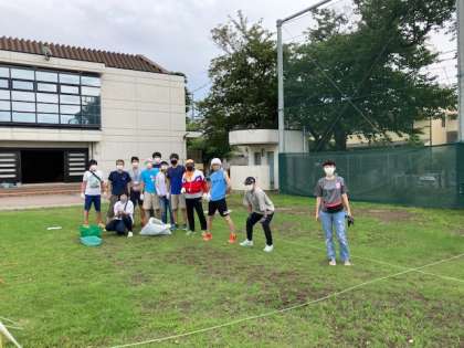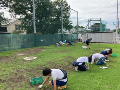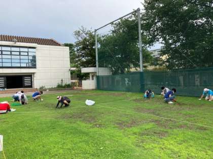 学校の芝生は現在養生中で、主事さんを中心に日々芝生のメンテナンスをしていますが、芝生の生長を上回る勢いで雑草が生長しています。おやじの会のみなさんがその話を聞いて、7月11日(土)にボランティアで芝生の雑草抜きをしてくだいました。午前7時15分集合と早い時間帯でしたが、たくさんの方が子供の登校時刻ぎりぎりまで作業してくださいました。