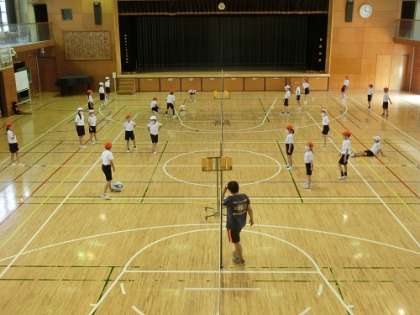 3年生は体育の時間に、体育館ではフロアーボール、校庭ではラケットベースボールを行っています。どちらの運動もチームで行うゲームで、チームでの作戦やチームワークがポイントとなります。