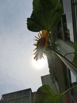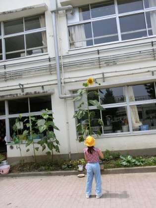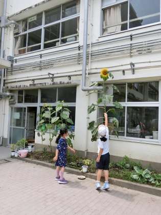 3年生が植えたひまわりがグングン生長しています。もう2階に届きそうで3mはあるでしょうか。通りかかった子供たちが、興味深くひまわりを見上げ、その高さに驚いています。