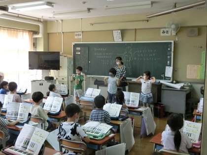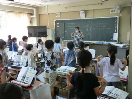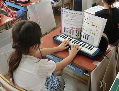1年生が、鍵盤ハーモニカの学習をしていました。感染症対策で残念ながら吹いて音を出すことはできませんが、階名を覚えるのに体の部位を使って楽しく活動していました。早く音が出せるようになるといいです。