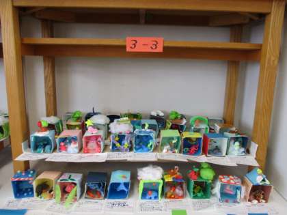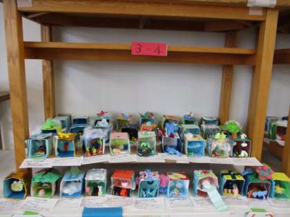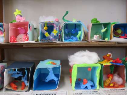 虫の世界、二階建ての家、お菓子やパンの国、お花畑、大好きにブランコ、動物園、水族館など・・・。どの子も一生懸命につくりました。子供の世界はほほえましい。くすっと笑顔になれました。