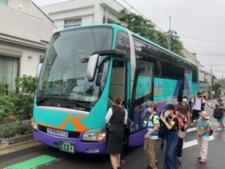?いよいよ河口湖移動教室に出発です。わかくさ学級の4〜6年生が参加します。出発式を行い、保護者の方に見送られ元気に出発しました。