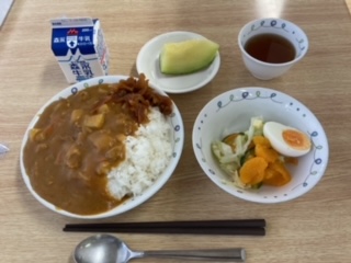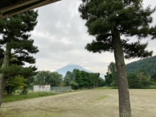 ?夕食です。いただきますの担当は桜町小学校です。しっかり役割をはたしました。今日の夕食は、カレーライス、サラダ、メロン、牛乳です。学校と同じで話をしないでしっかり食べていました。食堂からも富士山が見え眺めもいいです。