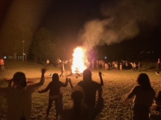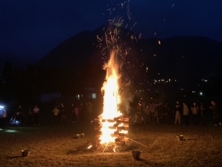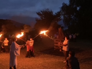 ? いよいよ楽しみにしていたキャンプファイヤーです。火の神から、友情の火、勇気の火、希望の火を授かり点火しました。炎は真っ赤に燃え上がりました。火を囲んでみんなで楽しい時間を過ごすことができました。