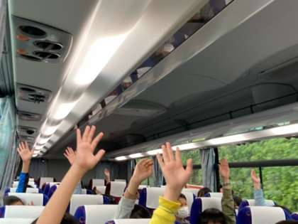?バスは日光へ向け東北道を順調に走っています。バスの中と言えばバスレクですが、感染症対策で残念ながら現在はできません。そこでバスガイドさんがガイドをしながら、ポイントごとにご当地クイズを出題してくださっています。学びながら楽しんでいます。