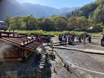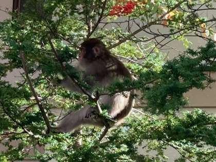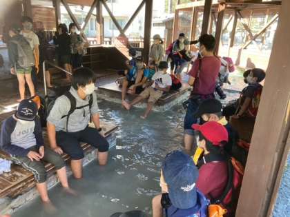 湯ノ湖湖畔を歩いて、ゴールの湯元に着きました。「やったー」と喜ぶ子、「もうくたくた」と言いなが らもうれしそうな顔している子、表し方は違いますが、みんなそれぞれ達成感を感じていました。湯元では源泉と足湯に行きました。そこでは何と猿と遭遇しました。鹿に続いて猿。今朝、虹を見たことを思い出しました。