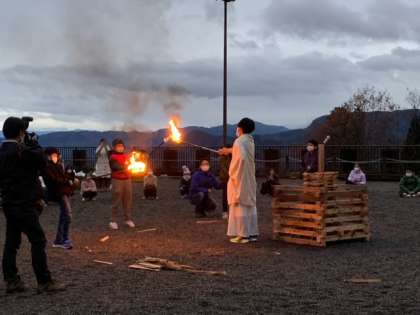 川場の火の神が現れ、火の子が聖なる火を授かりました。その火はにわかに大きな火となり、桜町小学校の子供たちをてらしました。