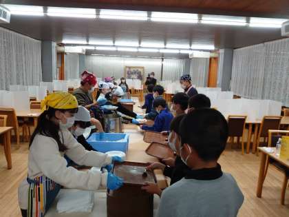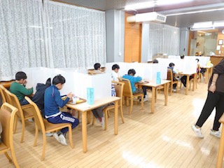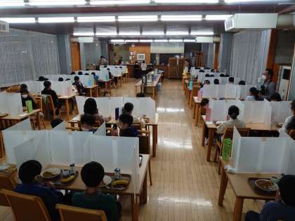 お待ちかねの夕食です。食事係も頑張っています。学校の給食と同じ形で配膳をしています。みんなマナーよく食べています。