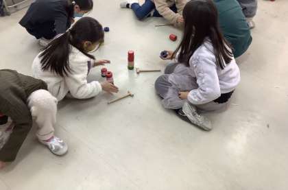 五色百人一首とだるま落としに取り組んでいます。どちらも初めは楽しむだけであったのが、だんだんと集中をして工夫しながら取り組む様子はさすが2年生でした。