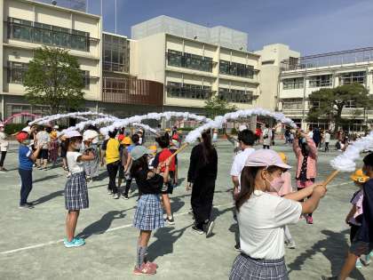 当日は、代表児童がアーチを持ち、