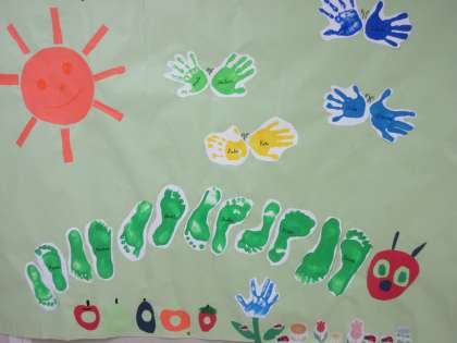 完成すると、今度は全員での共同作品を作りました。「はらぺこあおむし」の絵本の青虫の絵です。みんなの手形と足形が一つの作品になって、喜んでいました。