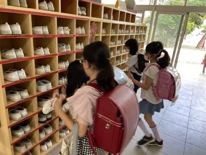 上は下校時に上履きをきれいに並べている4年生の子どもたち。