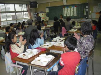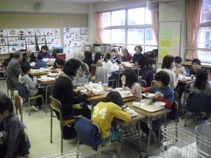 12月1日(木)、2年生が高齢者の方々(自分の祖父母)を招いて、給食を一緒に食べ、交流をしました。